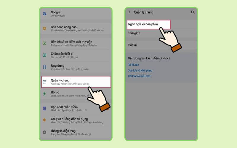 Mở Cài đặt trên điện thoại và chọn Quản lý chung. Vào mục Ngôn ngữ và bàn phím.