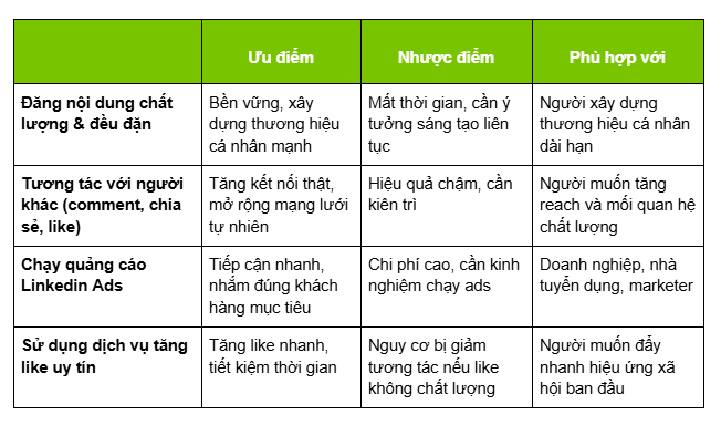 Hiện nay, có nhiều phương pháp để tăng lượt like và tương tác trên Linkedin, từ cách làm tự nhiên đến sử dụng dịch vụ hỗ trợ. Mỗi phương pháp đều có ưu – nhược điểm riêng, phù hợp với từng mục tiêu và nguồn lực. Dưới đây là bảng so sánh giúp bạn dễ dàng lựa chọn cách làm phù hợp nhất cho mình.