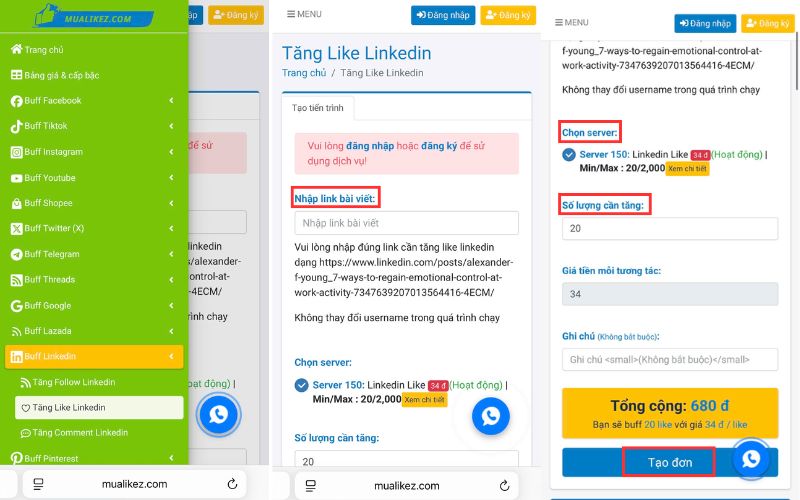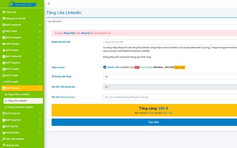 Vào “Buff LinkedIn” → chọn “Tăng Like LinkedIn”, dán đường link bài viết muốn tăng like vào ô yêu cầu, chọn gói phù hợp về số lượng và tốc độ. Sau đó bấm “TẠO ĐƠN”. Hệ thống sẽ tự động triển khai, đảm bảo lượt like tăng tự nhiên, an toàn và nhanh chóng.